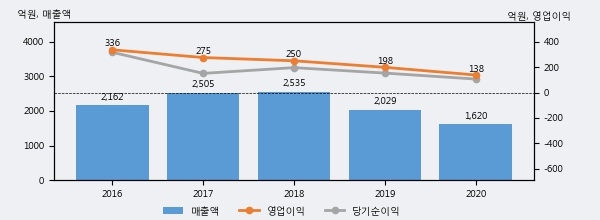 동아엘텍의 2020년 매출액은 1620억으로 전년대비 -20.2% 하락했고, 영업이익 역시 138억으로 전년대비 -30.6% 하락했다. 이 회사의 매출액 증감률과 영업이익 증감률은 각각 코스닥 하위 19%, 하위 37%에 해당된다.