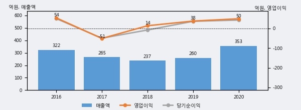 최근 실적을 살펴보면 2020년 매출액이 최근 5년 중 가장 높은 실적을 기록했음을 알 수 있다. 이전 최고 실적이었던 2016년 보다도 9.8%(31억 6천만원) 늘어난 것으로 나타났다.