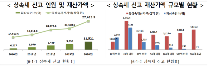2019년 상속인원(9555명), 상속재산(21조5380억원)보다 각각 20.6%, 27.3% 증가했다.