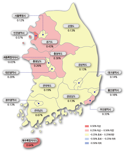 경기(0.21%→0.20%)는 상승폭이 감소했으나 서울(0.09%→0.10%)과 인천(0.41%→0.44%)은 커졌다.