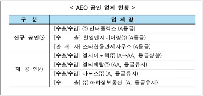 이번에 AEO 공인을 받은 업체는 향후 △수출입물품 검사비율 축소 △관세조사의 면제 △수입신고 시 담보제공 생략 등 경영안정에 실질적 도움이 되는 혜택과 기업상담전문관(AM)으로부터 AEO 사후관리 뿐만 아니라 관세행정 전반에 걸쳐 발생하는 애로사항에 대해 상담을 받을 수 있다.