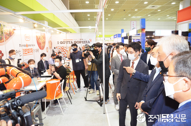 문 장관은 정 회장 등과 ▲커피베이(로봇 바리스타) ▲브이디컴퍼니(서빙·안내 로봇) ▲고피자(피자 커팅·소스드리즐 로봇) ▲배달특급(경기도 공공배달앱) ▲한컴말랑말랑 행복케어(ICT 시니어 헬스케어) 부스들과, 금일 상생협약을 체결한 4개사가 꾸린 '동행상생 브랜드관'을 방문해 업계를 격려했다.