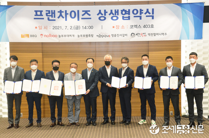 2일 ㈜제너시스비비큐(BBQ치킨), ㈜놀부(놀부부대찌개&보쌈족발), ㈜명륜당(명륜진사갈비), ㈜역전에프앤씨(역전할머니맥주) 4개사는 2일 서울 코엑스 컨퍼런스룸 403호에서 열린 '프랜차이즈 상생협약식'을 통해 상생협약을 체결했다.