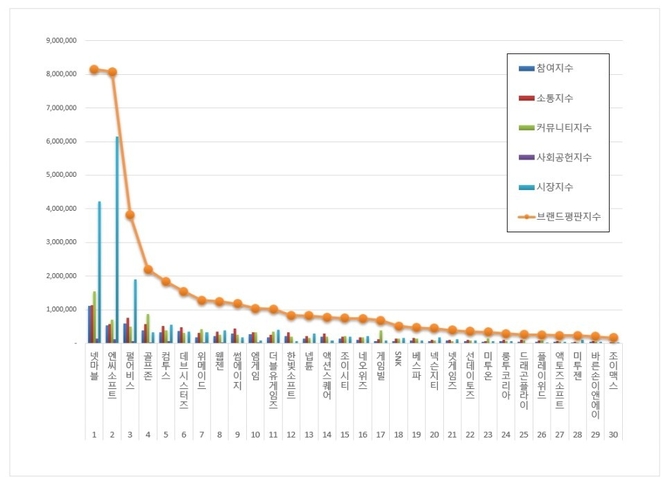 게임 상장기업 브랜드평판지수는 참여지수, 소통지수, 커뮤니티지수, 사회공헌지수, 시장지수를 합산해 산출했다.