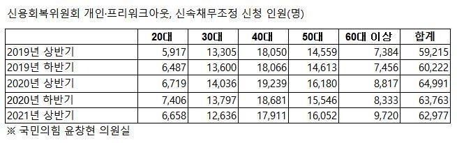 19일 국민의힘 윤창현 의원이 신용회복위원회(신복위)에서 받은 자료를 보면 올해 2분기 신복위에 개인·프리워크아웃, 신속채무조정 등 채무조정을 신청한 사람은 모두 3만1천302명이다.