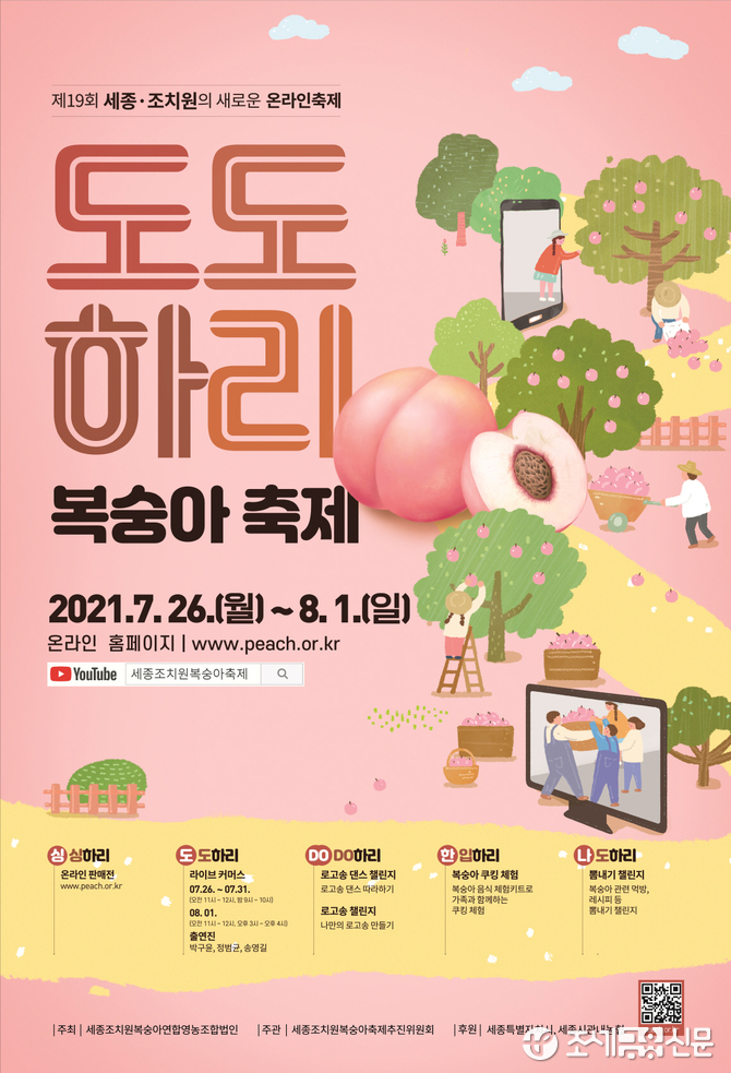 (조세금융신문=구재회 기자) 세종시는 26일부터 내달 1일까지 일주일 동안 '제19회 세종 조치원 복숭아축제'를 온라인으로 개최한다고 밝혔다.
