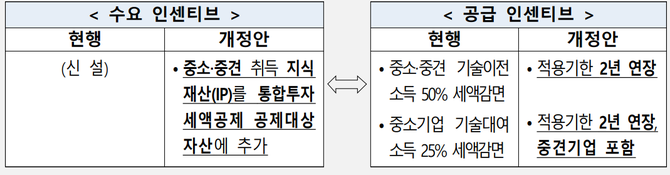 기계장치 등 사업용 유형자산 위주의 통합투자세액공제 대상자산을 중소 중견기업이 취득하는 지식재산까지 확대한다.