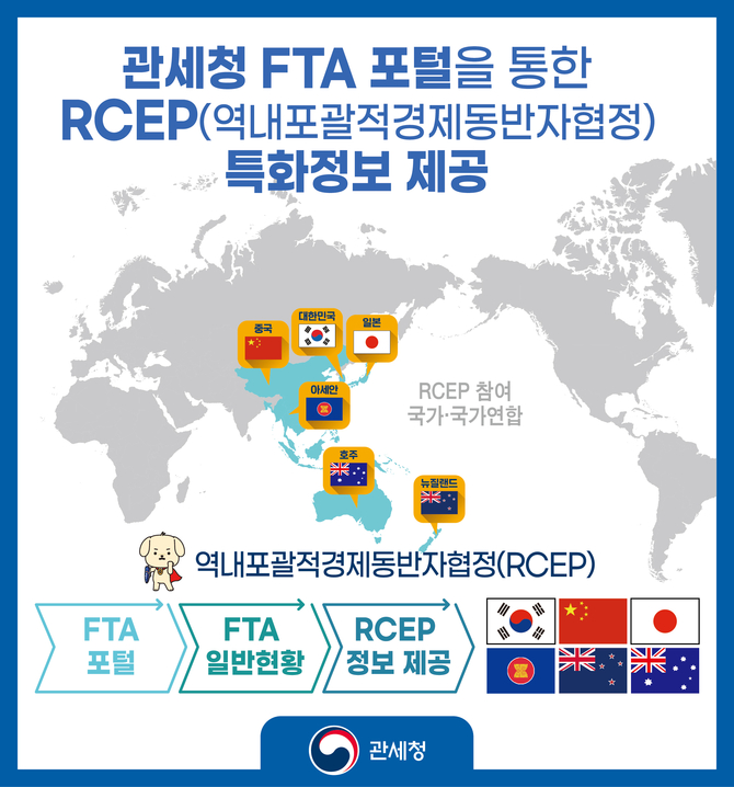 (조세금융신문=홍채린 기자) 관세청은 우리기업의 역내포괄적경제동반자협정(RCEP) 활용을 지원하기 위해 관세청 에프티에이 누리집을 통해 오늘부터 역내포괄적경제동반자협정 특화정보를 제공한다고 28일 밝혔다.