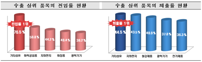품목별로 보면 수출·수입 기업수가 많은 상위 10개 품목을 분석한 결과, 수출은 마스크가 포함된 기타섬유가 진입률, 퇴출률 모두 높았다. 이는 코로나19로 마스크 산업에 신규 진입한 기업이 증가한 것이지만, 그만큼 퇴출한 기업도 많다는 것이다.