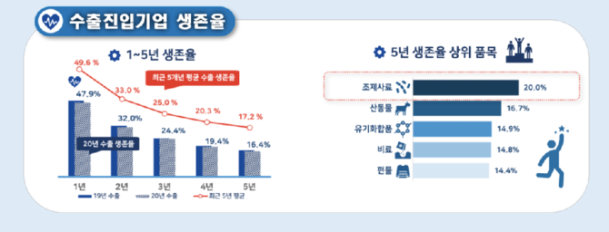 1년 생존률은 수출·수입 기업이 각각 47.9%, 수입 50.1% 증가했다. 기준은 19년도부터 20년까지 수출과 수입을 지속한 기업수의 비율이다.