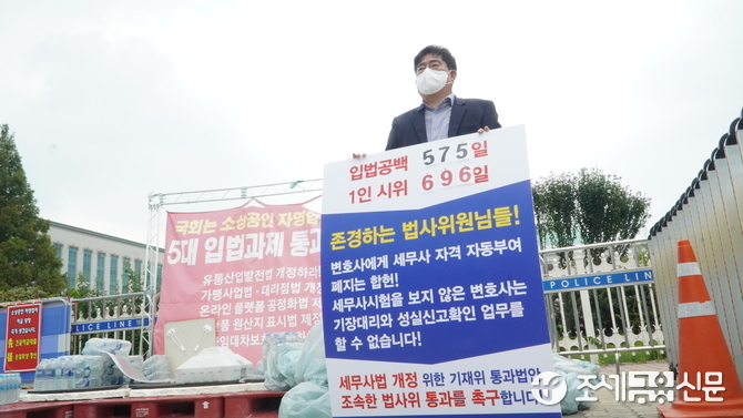(조세금융신문=방민성 기자) 이창식 한국세무사고시회장이 28일 국회 앞에서 세무사법 통과를 위한