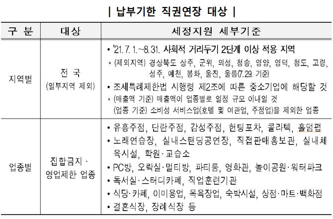 국세청은 코로나19 방역강화지역에 있거나, 집합금지‧영업제한 업종 중소기업에 대해 오는 11월 말까지 직권으로 납부기한을 연장하고, 그 밖에 코로나 19 피해사업자가 연장을 신청할 경우에도 적극 납부를 연장한다.