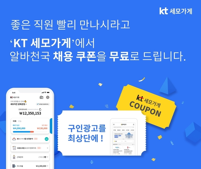 (조세금융신문=김종태 기자) 소상공인을 위한 간편 세무·경영관리 앱 서비스 ‘KT 세모가게’가 알바천국의 점프업 8회 상품을 무료로 이용할 수 있는 쿠폰을 제공한다.