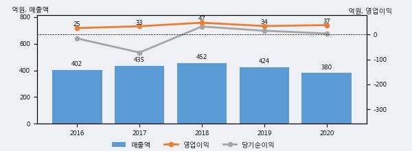네오티스의 2020년 매출액은 전년대비 -10.5% 줄어든 380억원이고, 영업이익은 전년대비 11.3% 늘어난 37억원을 기록했다. 이 회사의 매출액 증감률과 영업이익 증감률은 각각 코스닥 하위 31%, 상위 46%에 해당된다.