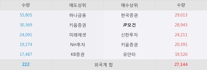 JP모건이 매수상위 창구 2위를 기록중이고, 그 외에 한국증권, 신한투자 등이 매수 창구 상위에 위치하고 있다.