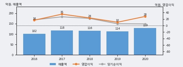 최근 실적을 살펴보면 2020년 매출액이 최근 5년 중 가장 높은 실적을 기록했음을 알 수 있다. 이전 최고 실적이었던 2017년 보다도 9.2%(10억 9천만원) 늘어난 것으로 나타났다.