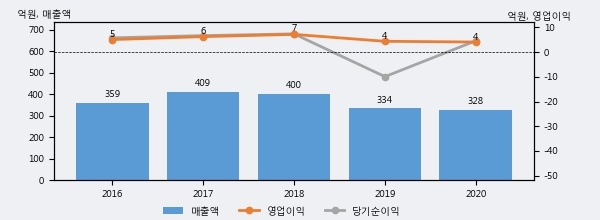 최근 3년간의 실적을 살펴보면, 매출액은 3년 연속 하락하고 있으나 그 하락폭은 줄어들고 있음을 알 수 있다.