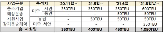이에 더해, '장기운송계약'을 통해 중소기업에 제공되는 선적 공간 350TEU가 추가 지원된다.