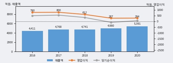 최근 실적을 살펴보면 2020년 매출액이 최근 5년 중 가장 높은 실적을 기록했음을 알 수 있다. 이전 최고 실적이었던 2019년 보다도 8.3%(411억 3천만원) 늘어난 것으로 나타났다.