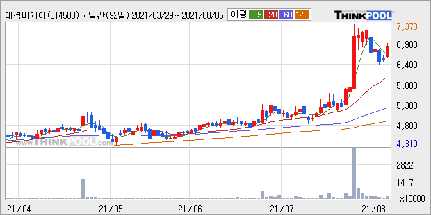 태경비케이의 2020년 매출액은 전년대비 -11.3% 줄어든 1654억원이고, 영업이익은 전년대비 179.1% 늘어난 108억원을 기록했다. 이 회사의 매출액 증감률과 영업이익 증감률은 각각 코스피 하위 29%, 상위 9%에 해당된다.