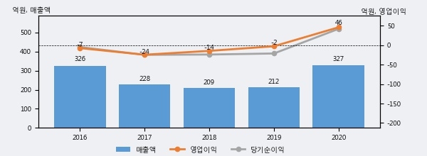 최근 실적을 살펴보면 2020년 매출액이 최근 5년 중 가장 높은 실적을 기록했음을 알 수 있다. 이전 최고 실적이었던 2016년 보다도 0.2%(7천만원) 늘어난 것으로 나타났다.