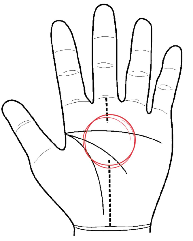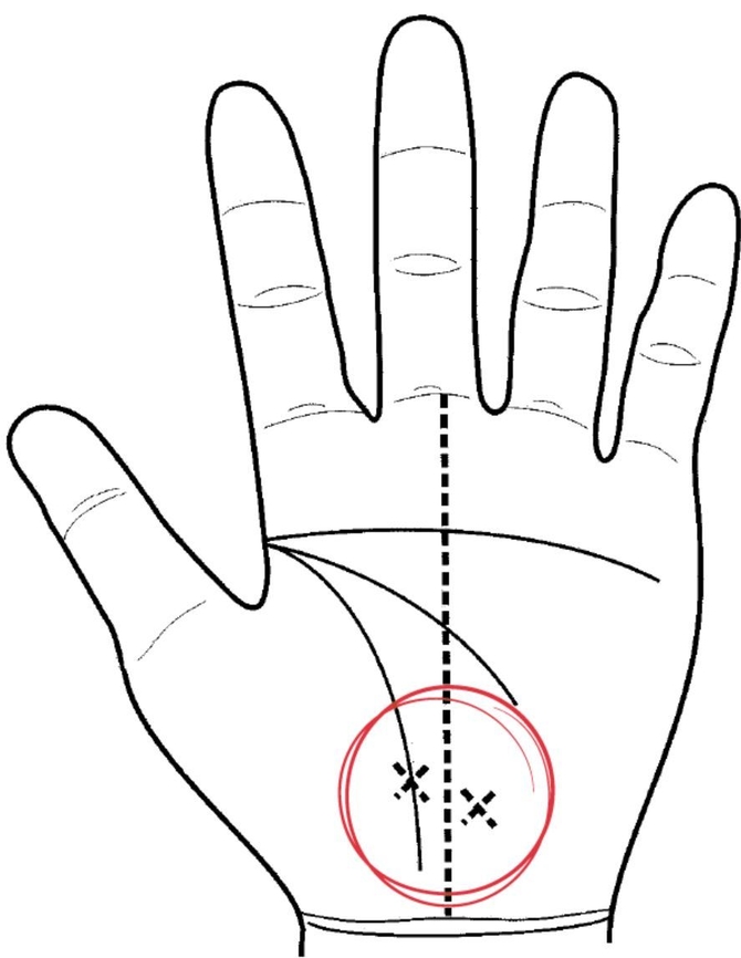 사고가 일어날 상. 운명선을 기준으로 금성구 쪽의 위와 같은 기호들은 육친과 가정사, 월구 쪽이라면, 사회대인관계 등 제3의 타인으로부터 문제가 발생한다.