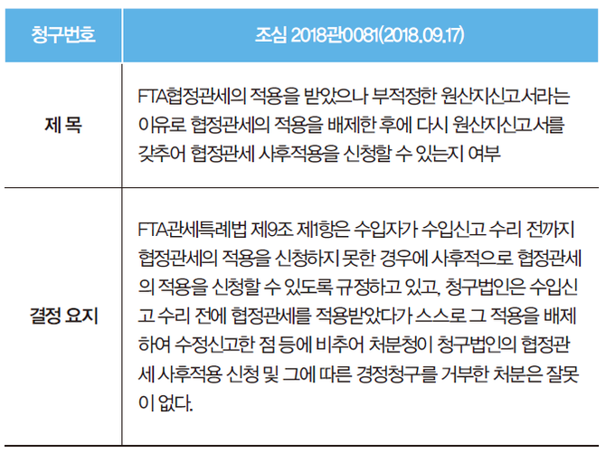 FTA협정관세 사후적용은 수입신고 수리 전까지 제8조에 따른 협정관세의 적용신청을 하지 못한 수입자에 한해 사후적용을 허용한다는 것이 관세청의 기존 입장이었다(「자유무역협정관세 재적용 처리 방법」, 2014.11.5). 이는 다음과 같이 조세심판원 결정례에서도 최근까지 확인되고 있다. 그러나 이는 FTA사후적용 신청 시 많은 이슈가 되어왔다.