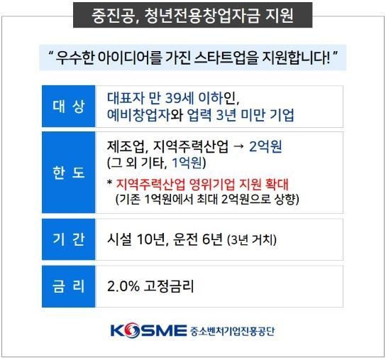 지원 대상은 대표자가 만 39세 이하인 예비창업자 또는 창업 3년 미만의 중소기업이다. 지원 한도는 제조기업과 지역주력사업 영위 기업은 최대 2억원, 그 외는 1억원으로 연 2.0%의 고정금리가 적용된다.