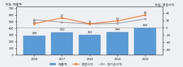 최근 실적을 살펴보면 2020년 매출액이 최근 5년 중 가장 높은 실적을 기록했음을 알 수 있다. 이전 최고 실적이었던 2019년 보다도 17.3%(59억 4천만원) 늘어난 것으로 나타났다.