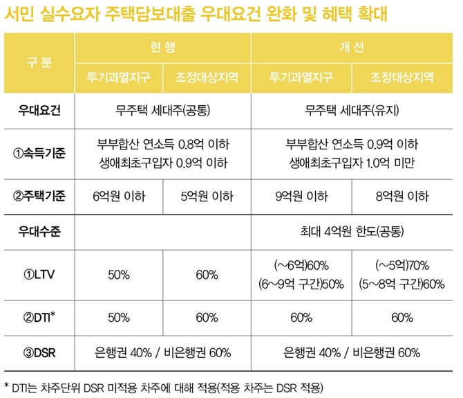 7월 1일부터 주택담보대출 우대혜택을 받을 수 있는 요건이 완화됐다. 부부합산 소득 기준은 8000만원 이하에서 9000만원 이하로 상향됐다. 생애최초 구입자의 경우 9000만원 이하이던 기준이 1억원 미만으로 조정됐다.