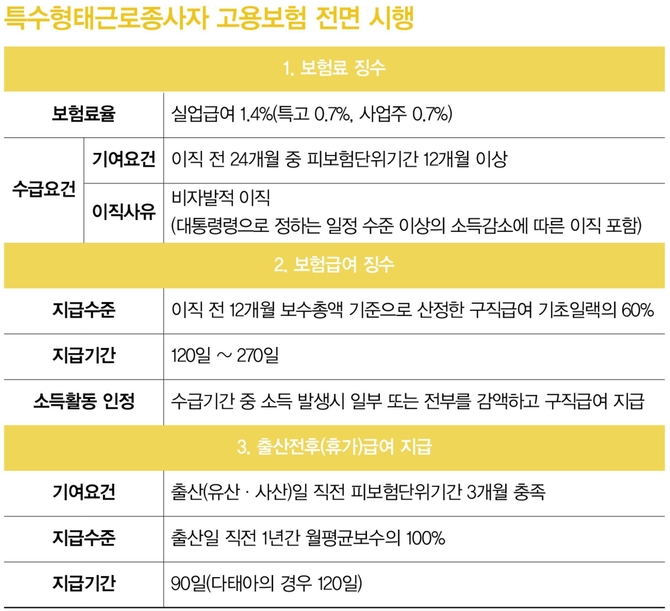 특수형태근로종사자도 실업급여와 출산전후급여를 받을 수 있게 됐다. 7월 1일부터 적용되는 직종은 보험설계사, 신용카드회원 모집인, 대출 모집인, 학습지 방문강사, 교육교구 방문강사, 택배기사, 대여제품 방문 점검원, 가전제품 배송·설치 기사, 방문판매원, 화물차주, 건설기계 조종사, 방과후 학교강사다.
