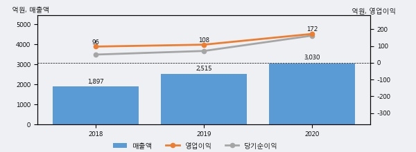 최근 실적을 살펴보면 2020년 매출액이 최근 3년 중 가장 높은 실적을 기록했음을 알 수 있다. 이전 최고 실적이었던 2019년 보다도 20.5%(515억 2천만원) 늘어난 것으로 나타났다.