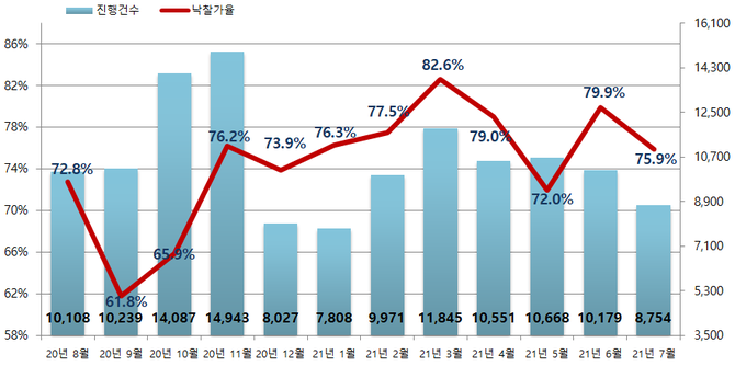 법원경매 전문기업 지지옥션이 9일 발표한 '2021년 7월 경매동향보고서'에 따르면 전국 경매 진행건수는 8750건으로 이 중 3445건이 낙찰됐다. 낙찰률은 39.4%, 낙찰가율은 75.9%를 기록했고 평균응찰자 수는 4명으로 집계됐다.