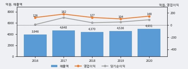 최근 실적을 살펴보면 2020년 매출액이 최근 5년 중 가장 높은 실적을 기록했음을 알 수 있다. 이전 최고 실적이었던 2017년 보다도 6.1%(283억원) 늘어난 것으로 나타났다.