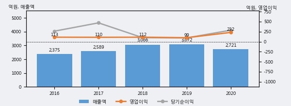 동화약품의 2020년 매출액은 전년대비 -11.4% 줄어든 2721억원이고, 영업이익은 전년대비 133.4% 늘어난 232억원을 기록했다. 이 회사의 매출액 증감률과 영업이익 증감률은 각각 코스피 하위 28%, 상위 11%에 해당된다.