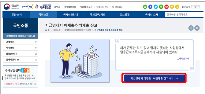 지급명세서가 사실과 다르게 제출되었거나 미제출된 근로자의 경우, 국세청 홈페이지 내 ‘지급명세서 미제출・허위제출 신고’ 메뉴에서 신고할 수 있다.