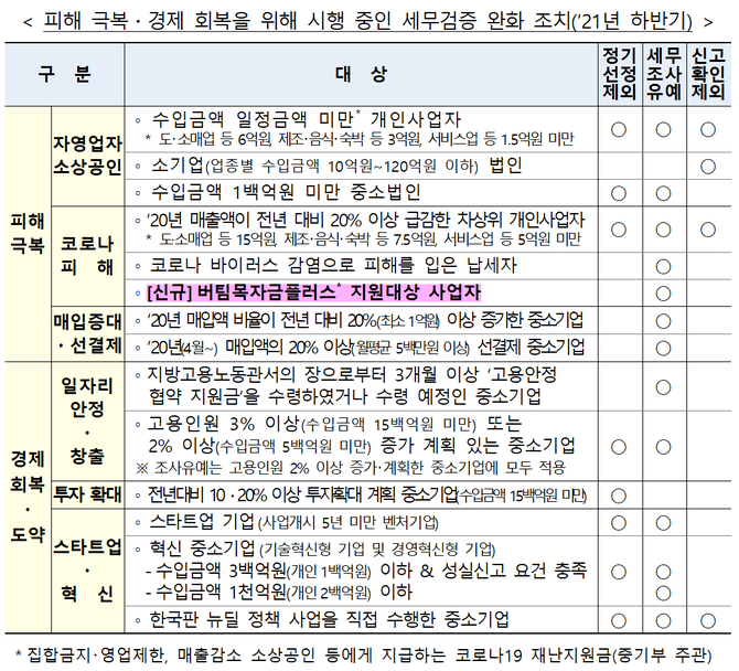 올 하반기에는 집합금지‧경영위기 등의 이유로 버팀목자금플러스 지원을 받는 모든 사업자를 세무조사유예 대상에 신규 추가하기로 했다.