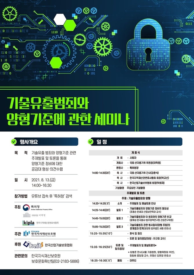 특허청은 13일 서울 강남구 '인터컨티넨털 서울 코엑스'에서 더불어민주당 이학영 의원, 한국지적재산권변호사협회와 공동으로 '기술 유출범죄와 양형기준 학술 세미나'를 열어 양형기준의 관점에서 기술 유출범죄 근절 방안을 모색했다.
