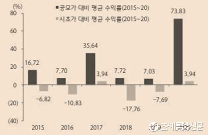 그러나 시초가 대비 평균 수익률은 2017년(3.94%)과 2020년(3.94%)을 제외하면 마이너스였다. 2018년(-17.76%)과 2016년(-10.83%)에는 두 자릿수 하락률을 나타냈다. IPO 기업들의 주식을 청약 시점에 공모가에 사는 것이 높은 수익률을 얻는 데 유리하게 작용한다는 분석이다.
