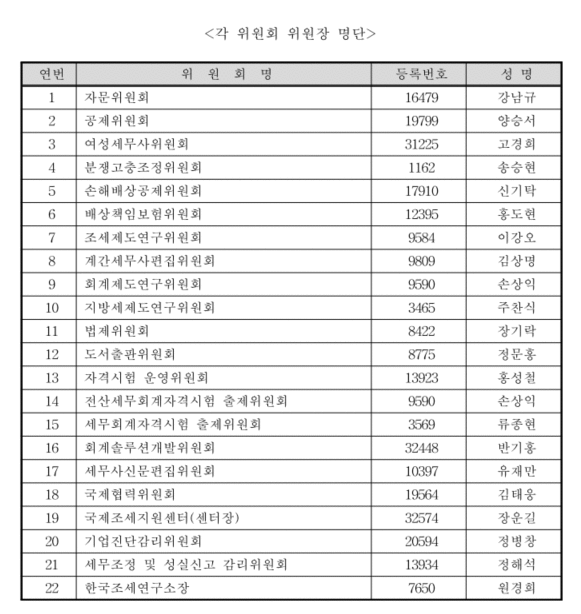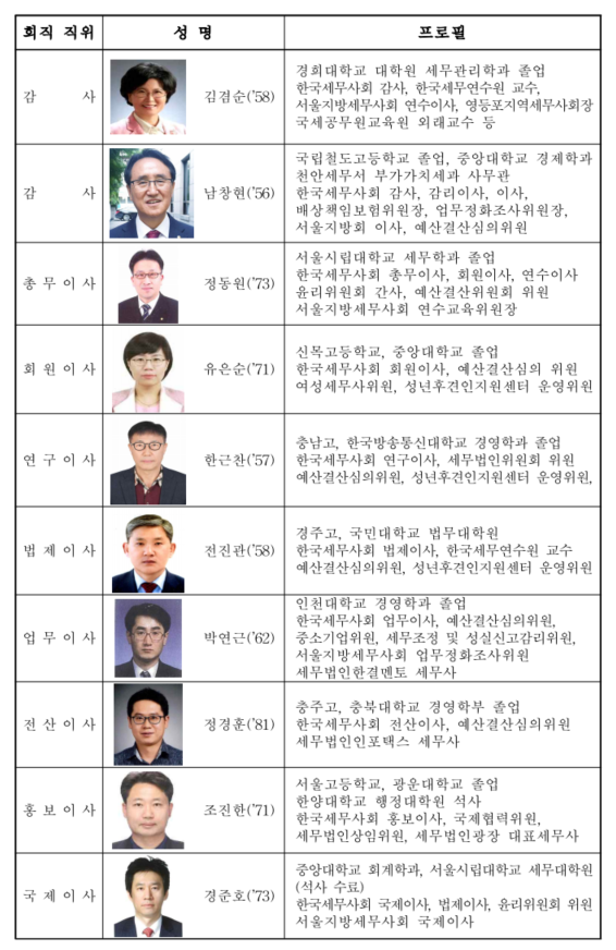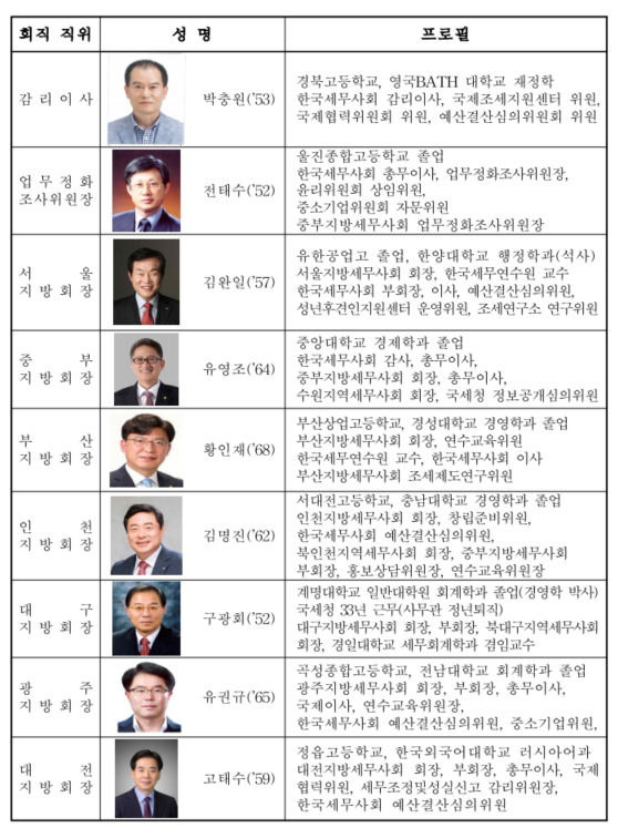 이에 따라 총무이사에는 정동원, 회원이사에는 유은순, 연구이사에는 한근찬, 법제이사에는 전진관, 업무이사에는 박연근, 전산이사에는 정경훈, 홍보이사에는 조진한, 국제이사에는 경준호, 감리이사에는 박충원 세무사가 임명됐으며 업무정화조사위원장은 전태수 세무사가 유임됐다.