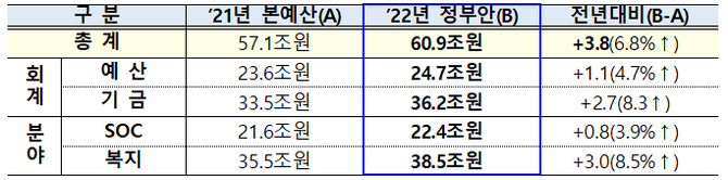올해 57조1000억원보다 6.8%(3조8000억원) 증가한 역대 최대 규모다. 내년도 정부 전체 총지출 604조원의 10.1% 수준이다.