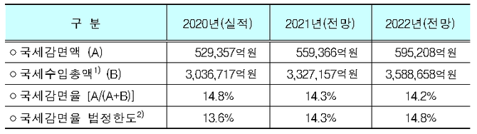지난해 국세감면액은 52조9000억원으로 전년 대비 3조3000억원 증가했다. 국세감면율은 14.8%로 법정한도(13.6%)를 1.2%P 초과했다. 국세감면율 법정한도는 직전 3년 국세감면율 평균에 0.5%P를 더해서 계산한다. 법정한도는 정부의 재정 건전성 제고 노력을 강조하기 위해 국가재정법상 강행규정이 아닌 '권고사항'으로 규정하고 있다.