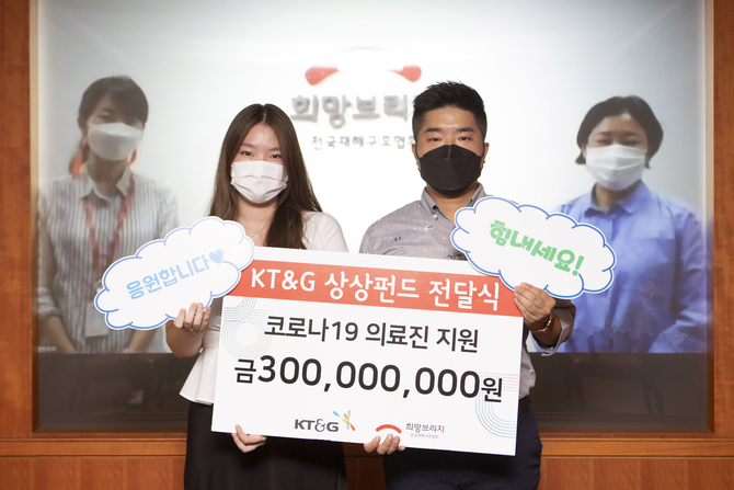 KT&G는 이미 국내 코로나 발생 초기였던 2020년 2월, 자가격리자와 의료진을 대상으로 5억 원을 기부한 바 있다. 이 성금은 전국재해구호협회에 전달돼 식료품과 방역물품 구매에 사용됐다. 또한, KGC인삼공사와 함께 10억 6000만원 상당의 정관장 홍삼 제품을 방역 현장에서 고군분투 중인 의료진과 관련 종사들에게 전달했다.