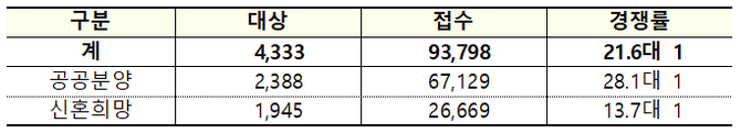 1차 지구 접수결과(경쟁률) ‘공공분양’(2388가구)은 6만7129명이 신청해 28.1대 1을 기록했다.