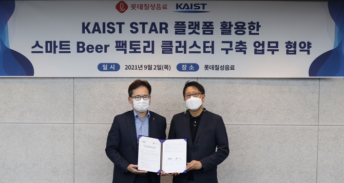 (조세금융신문=홍채린 기자) 롯데칠성음료가 2일 KAIST와 함께 ‘KAIST STAR 플랫폼을 활용한 스마트 비어 팩토리 클러스터 구축’을 위한 업무 협약을 진행했다.