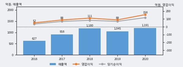최근 실적을 살펴보면 2020년 매출액이 최근 5년 중 가장 높은 실적을 기록했음을 알 수 있다. 이전 최고 실적이었던 2018년 보다도 0.9%(11억 1천만원) 늘어난 것으로 나타났다.