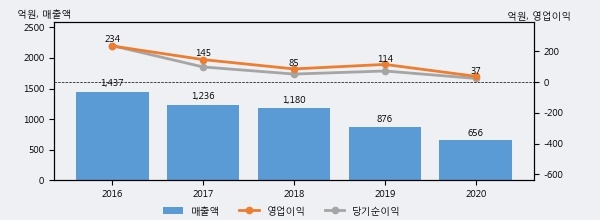 최근 3년간의 실적을 살펴보면, 매출액은 3년 연속 하락하고 있으나 그 하락폭은 줄어들고 있음을 알 수 있다.