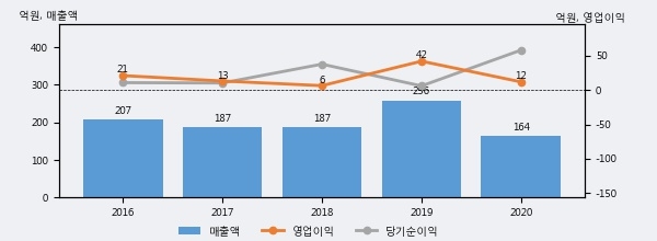 써니전자의 2020년 매출액은 전년대비 -35.9% 줄어든 164억원이고, 영업이익 역시 전년대비 -71.6% 줄어든 12억원을 기록했다. 이 회사의 매출액 증감률과 영업이익 증감률은 각각 코스피 하위 6%, 하위 19%에 해당된다.