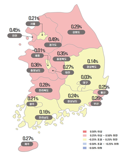 지방은 0.2%에서 0.23%로 상승폭이 커졌고 세종은 -0.01% 하락했다. 세종은 나성·보람동을 포함한 행복도시를 중심으로 하락세를 지속하는 가운데, 지난주 대비 하락폭이 줄었다.