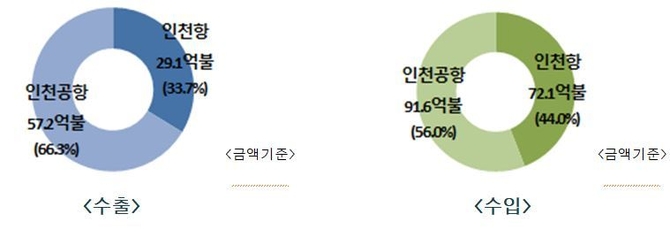 운송수단별로는 인천공항을 통한 항공이 수출 비중이 컸다. 인천공항을 통한 항공 수출은 57.2억 달러로 집계됐다. 이는 전체에서 66.3% 차지한다. 수입은 91.6억 달러로, 56.0%의 비중을 차지했다.